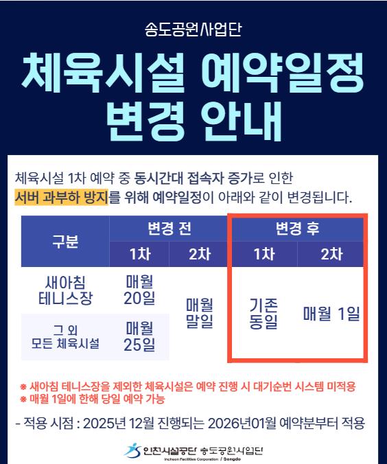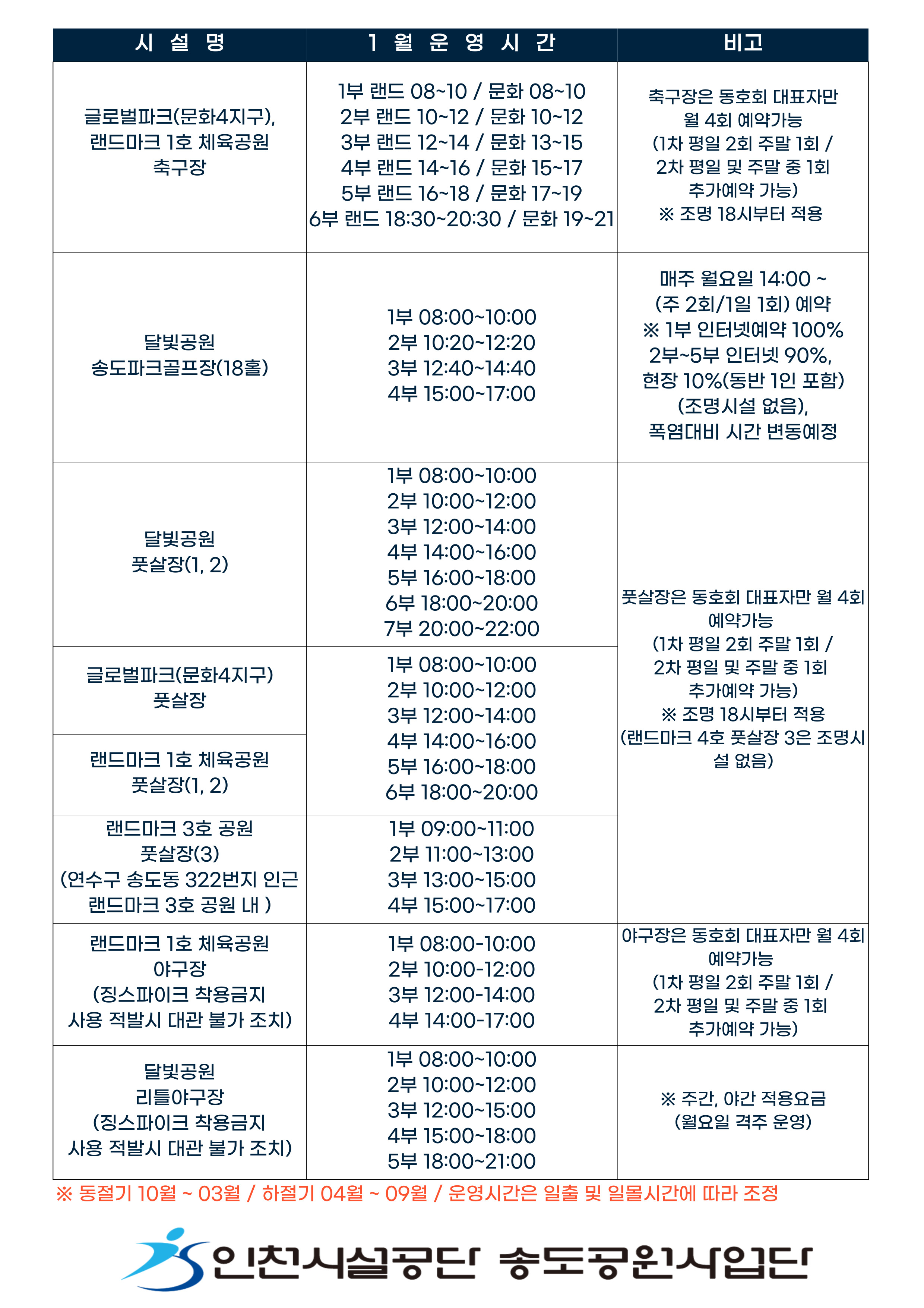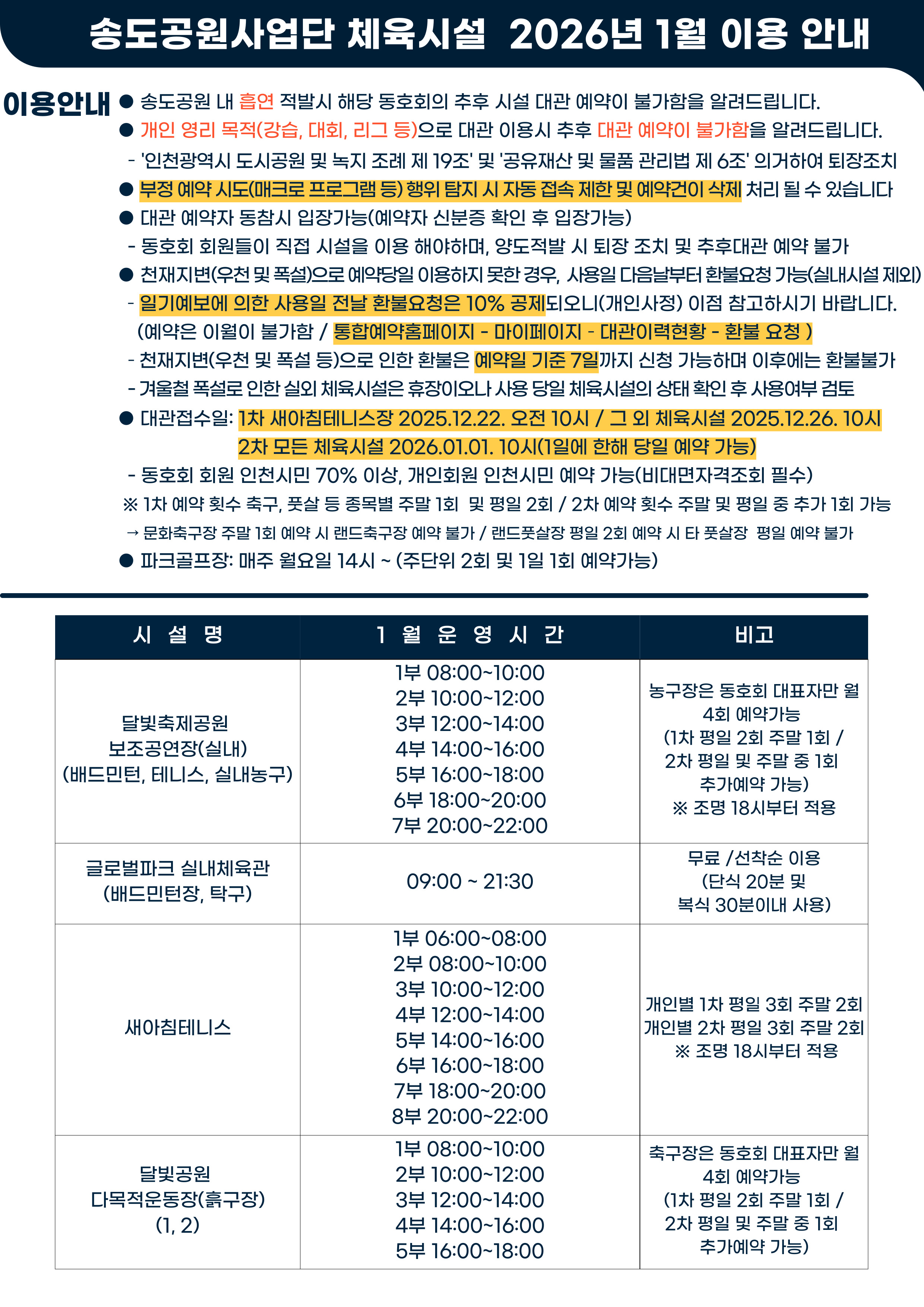 2026년 1월 송도공원내 체육시설 예약변경 및 이용안내