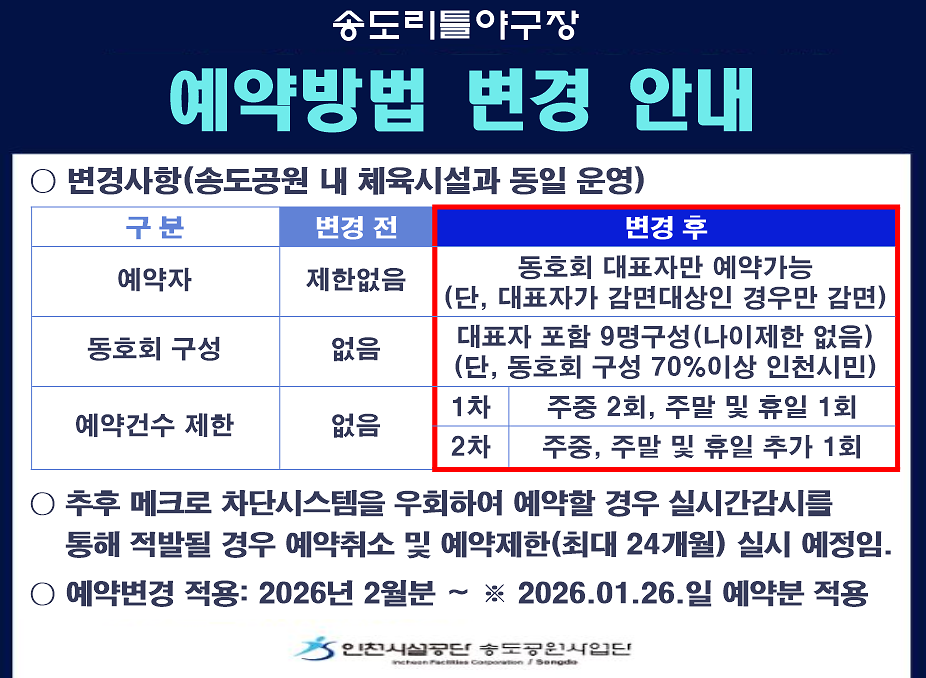 2026년 2월 송도리틀야구장 예약방법 변경 안내