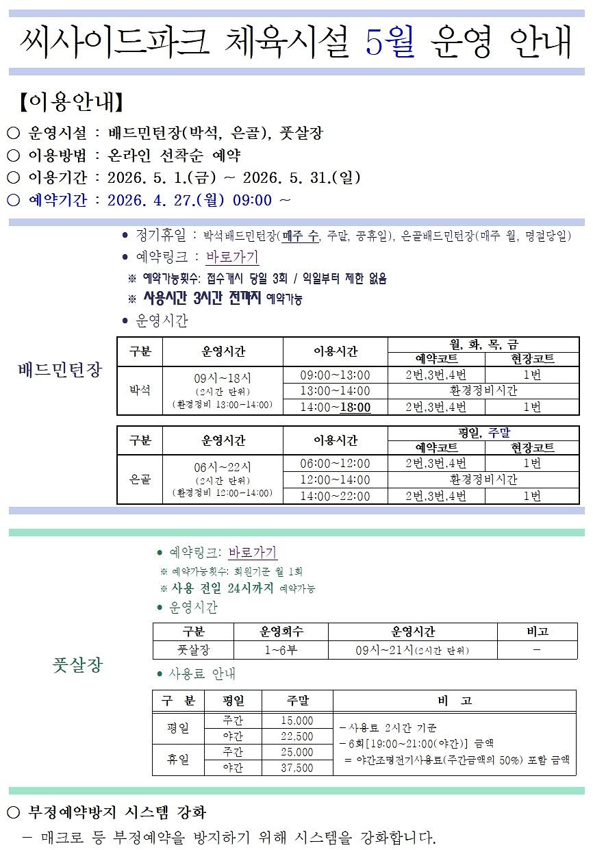 2026년 씨사이드파크 5월 체육시설 운영 안내