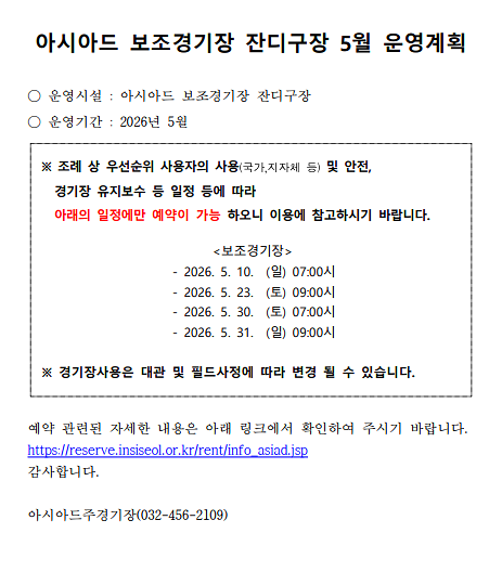 2026년 5월 아시아드경기장 보조경기장 이용안내